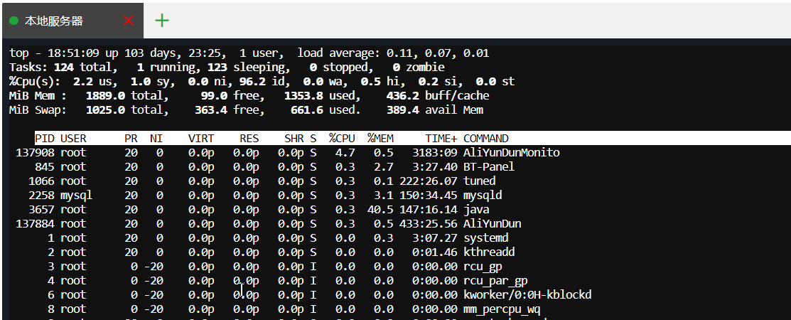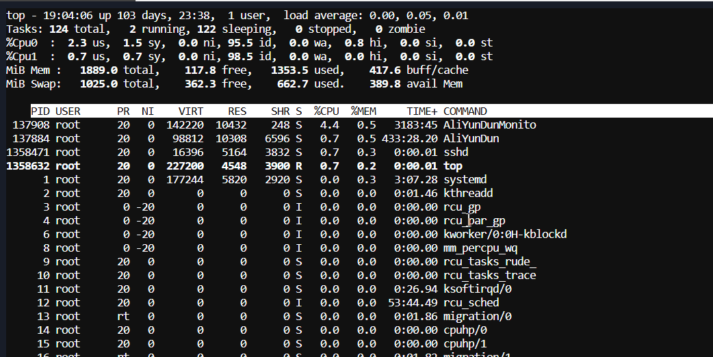 free内存只有 99 MiB,但avail Mem(389.4 MiB)才是更准确的“可用内存”。- Swap 使用量高(661.6 MiB) 是一个警告信号,可能引起性能下降(磁盘比内存慢得多)。建议: